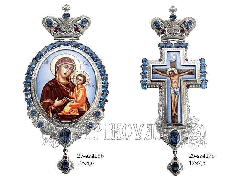 Ασημένιο αρχιερατικό σετ με ρώσσικα χειροποίητα σμάλτα και ζιρκόν καρφωτές πέτρες. Παραδίδονται με επίχρυση αλυσίδα μήκους 1,2 μέτρα και κουτια πολυτελείας. Κορυφαία ποιότητα κατασκευής Τα ασημένια προϊόντα φέρουν σφραγίδα γνησιότητας του μετάλλου. (Τα χρώματα στα σμαλτα ενδέχεται να διαφέρουν λόγω χειροποίητης κατασκευής)